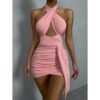 Turn heads effortlessly with this stunning cross-neck ruched mini dress designed to highlight your curves in all the right places. Featuring a stylish halter cross neckline with a bold front cut-out, this dress blends elegance with a touch of sexy. The ruched sides create a flattering, body-hugging fit, while the soft stretch fabric ensures comfort and confidence all day or night.
