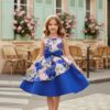 This stunning girls’ party dress features a beautiful pink floral bodice adorned with bold blue roses, perfectly paired with a rich royal-blue flared skirt. The layered design adds volume and elegance, while the statement bow at the waist gives it a classy, princess-worthy finish.