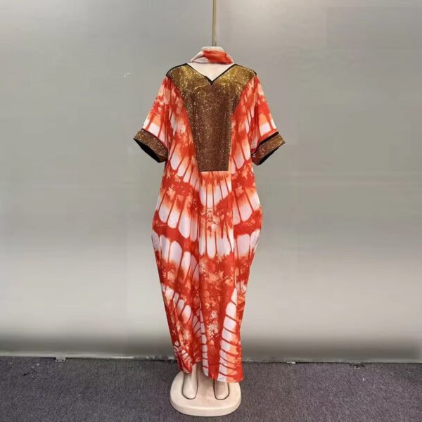 Step out in effortless elegance with this stunning tie-dye kaftan dress, designed to blend comfort with bold style. Featuring a flowing silhouette, this piece showcases a vibrant orange and white tie-dye pattern beautifully complemented by a rich gold-toned front panel and neckline detail. The loose, breathable fit makes it perfect for all body types, while the wide sleeves add a touch of sophistication and grace.