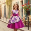This stunning girls’ party dress is designed to steal the spotlight. Featuring a soft pink floral print adorned with elegant purple roses, it’s beautifully finished with a bold statement bow at the waist for a classy, princess-like touch. The layered skirt adds volume and charm, making it perfect for twirls, smiles, and unforgettable memories.