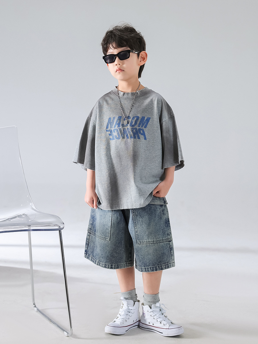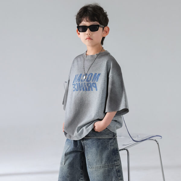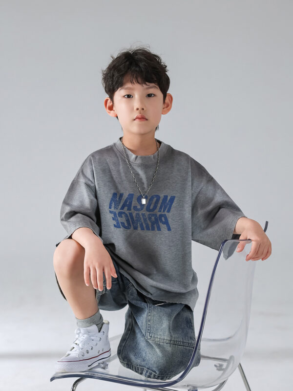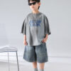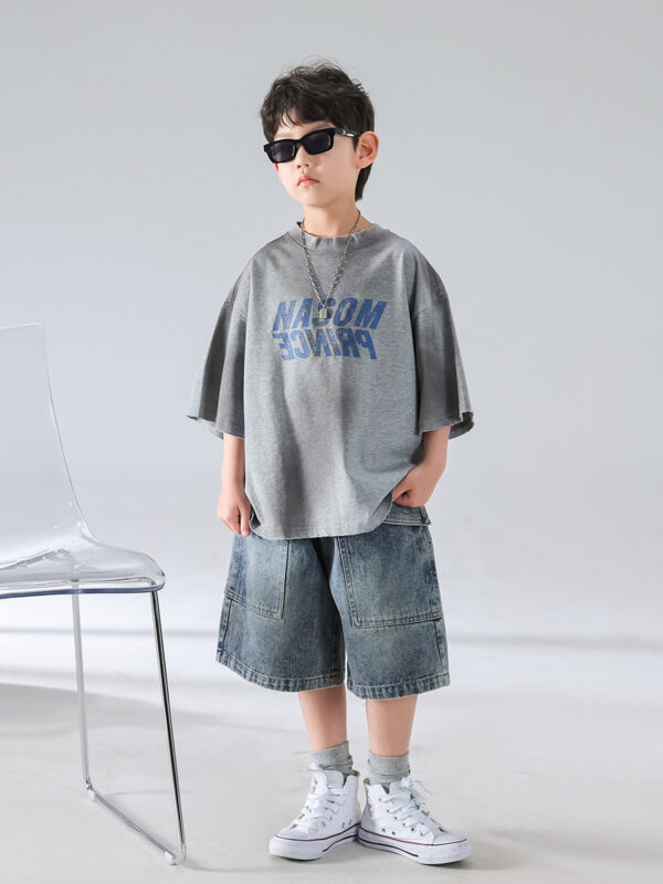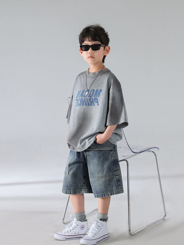Level up your child’s fashion game with this effortlessly cool Urban Streetwear Set. Designed for comfort and attitude, this two-piece outfit features an oversized gray graphic tee with bold “MODERN PRINCE” lettering, paired with relaxed-fit, washed denim shorts that scream casual style.