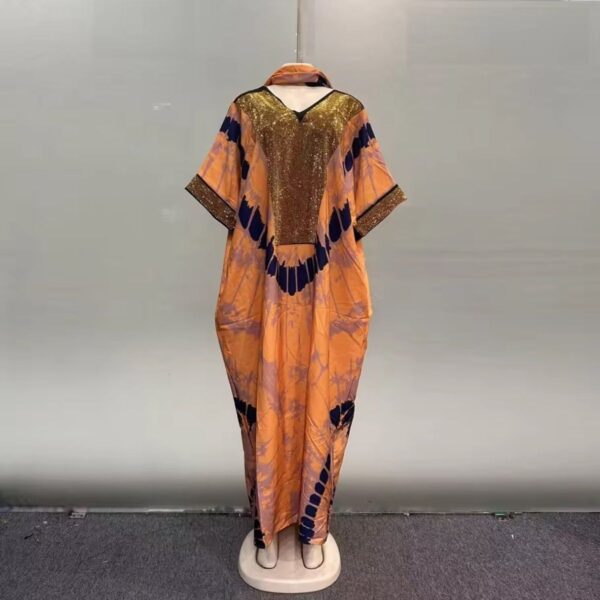 Step out in effortless elegance with this stunning luxury kaftan. Designed with a rich tie-dye pattern in warm earthy tones, it features a glamorous gold sequin panel that adds a touch of sparkle and class. The free-flowing silhouette offers maximum comfort while maintaining a bold, elegant look—perfect for special occasions or stylish everyday wear.