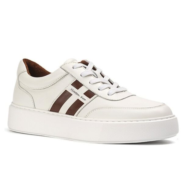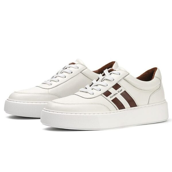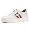 Step up your style with these sleek and versatile Men’s Casual Leather Sneakers. Designed for everyday wear, these sneakers combine modern minimalism with classic athletic inspiration. The crisp white leather upper is complemented by bold brown side stripes, adding a touch of contrast and personality.