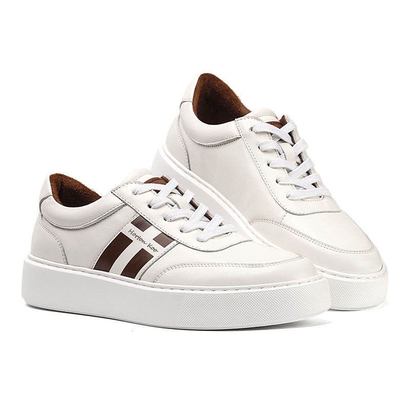Step up your style with these sleek and versatile Men’s Casual Leather Sneakers. Designed for everyday wear, these sneakers combine modern minimalism with classic athletic inspiration. The crisp white leather upper is complemented by bold brown side stripes, adding a touch of contrast and personality.