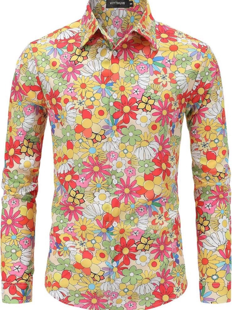 Step into a time machine of style with this Men’s Retro Floral Button-Up Shirt, where vintage charm meets bold color. Bursting with a lively mix of daisies, sunflowers, and classic blooms in shades of red, yellow, orange, pink, and green, this shirt is a full-on floral fiesta. The soft yellow background enhances the colorful pattern, giving it a sunshine-drenched 70s vibe.